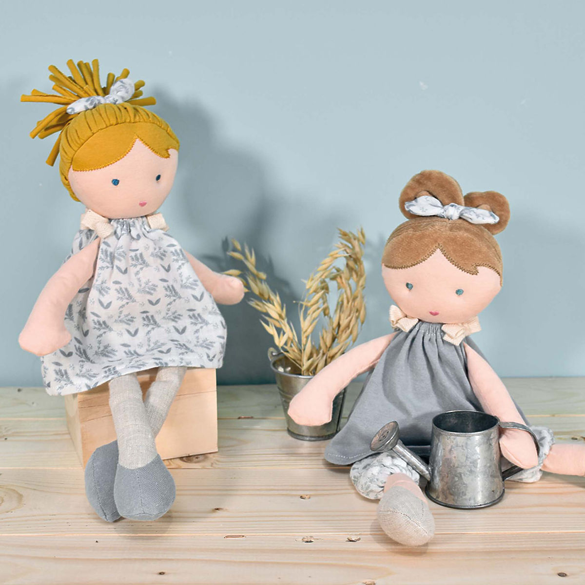Cette petite poupée adorable nommée Bleuette est fabriquée en coton biologique et son rembourrage est composé à 100% de fibres de polyester recyclé. La poupée porte une robe bleu et blanc qui s'harmonise délicatement avec son ruban dans les cheveux. La poupée est livrée dans une belle boîte cadeau ronde en bois naturel. Le jouet est conforme aux normes de sécurité européennes CE. Entretien : Lavez à 30° en bain. Recommandation : Séchage naturel ou à basse température. Principales caractéristiques : convient dès la naissance, fabriqué en coton biologique, visage en coton, yeux et bouche brodés en forme de cœur, emballé dans une boîte cadeau ronde en bois naturel.