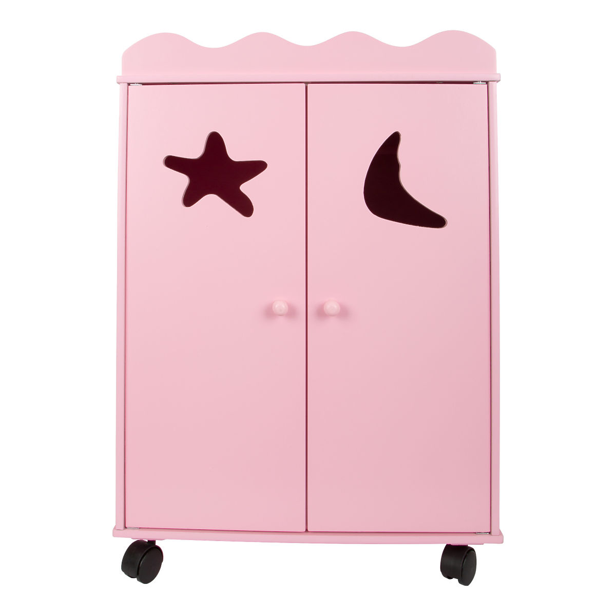 Armoire laquée sur roulettes, offrant beaucoup d'espace pour chaque pièce de la garde-robe de vos poupées. Le côté gauche se compose de deux étagères, tandis que le côté droit est destiné à suspendre les vêtements. Les portes présentent deux motifs, une étoile et une lune, qui rendent cette armoire encore plus adorable ! Principales caractéristiques : armoire en bois spacieuse, tringle à vêtements avec étagères, portes avec fermeture magnétique