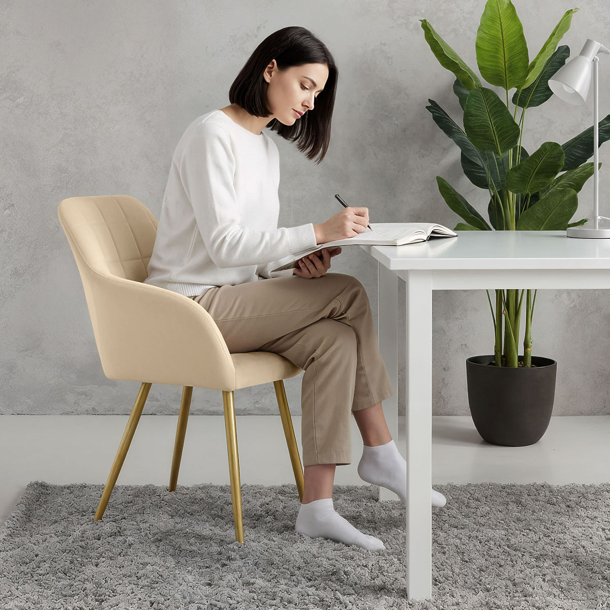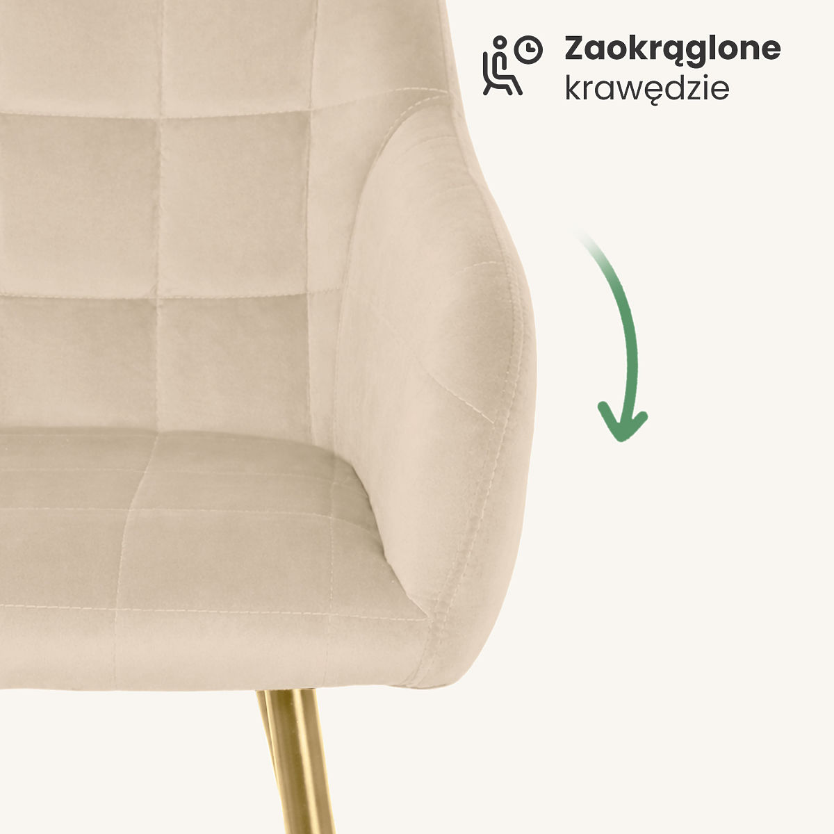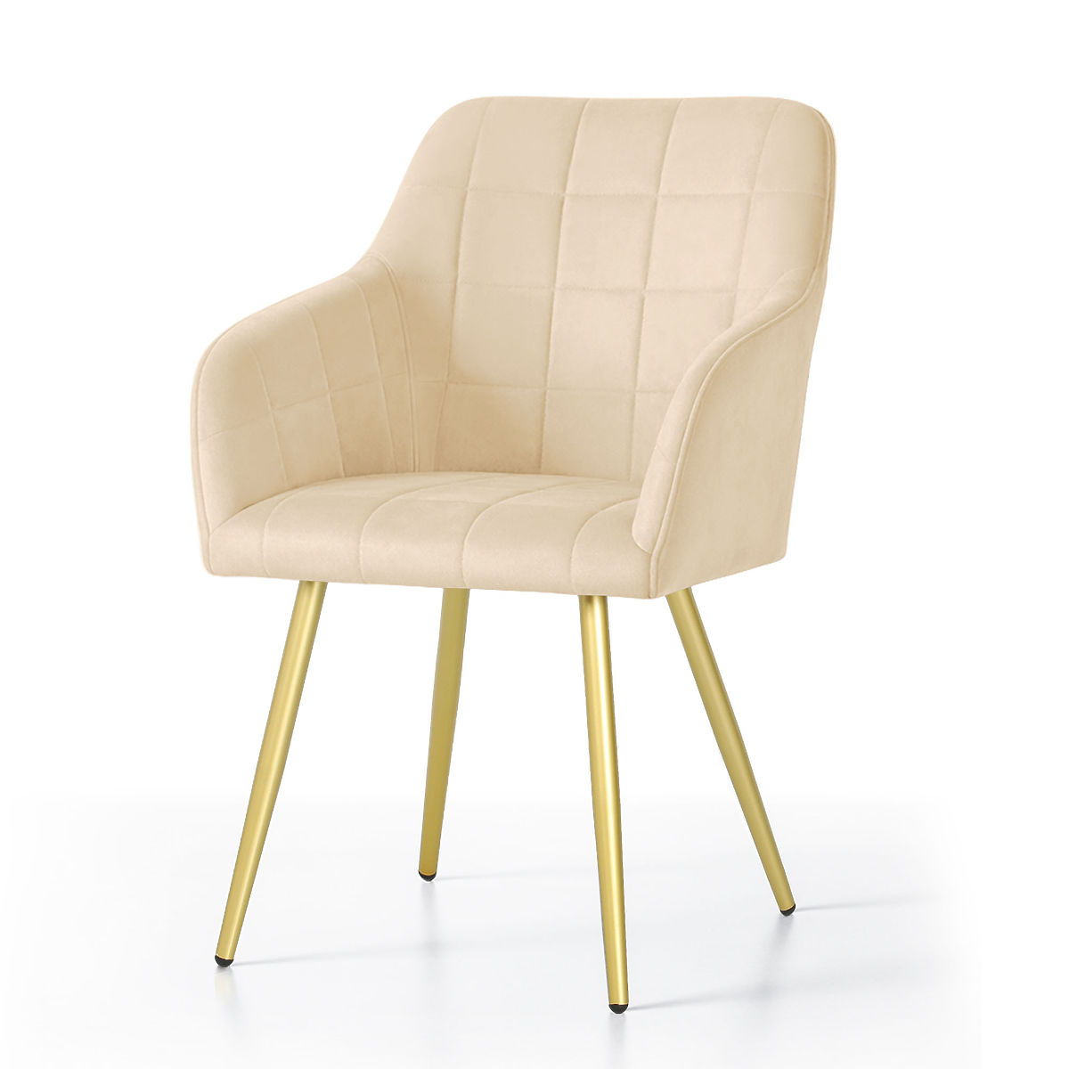 Chaise rembourrée beige avec pieds dorés et surpiqûres carrées. .. plus
