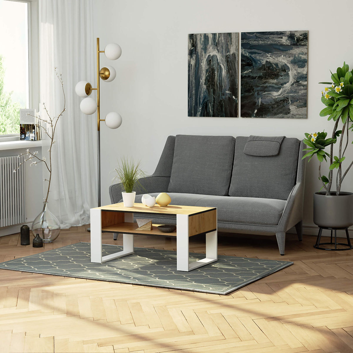 Table basse en chêne craft avec pieds blancs et étagère fonctionnelle. .. plus