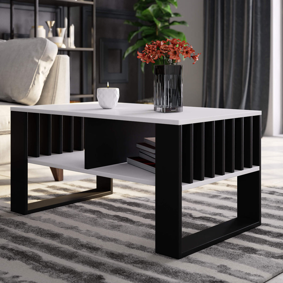 Table basse blanche avec pieds noirs, design moderne et dimensions pratiques. .. plus