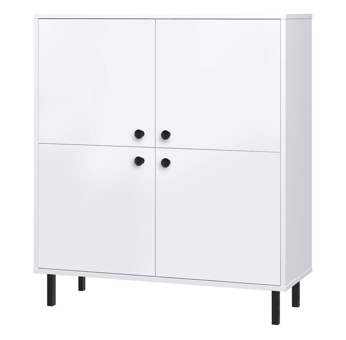Commode Venus blanche avec quatre portes et pieds en métal noir. .. plus