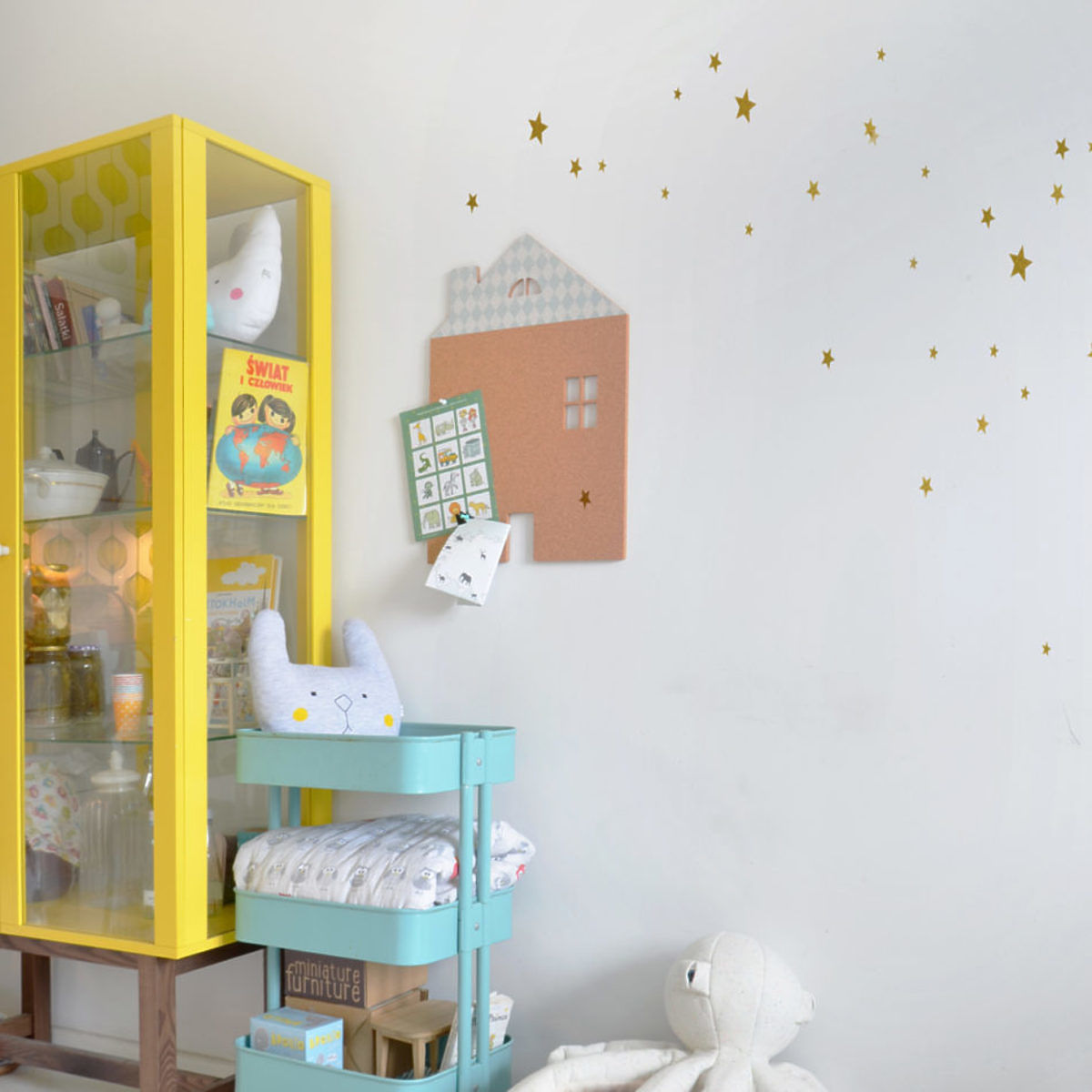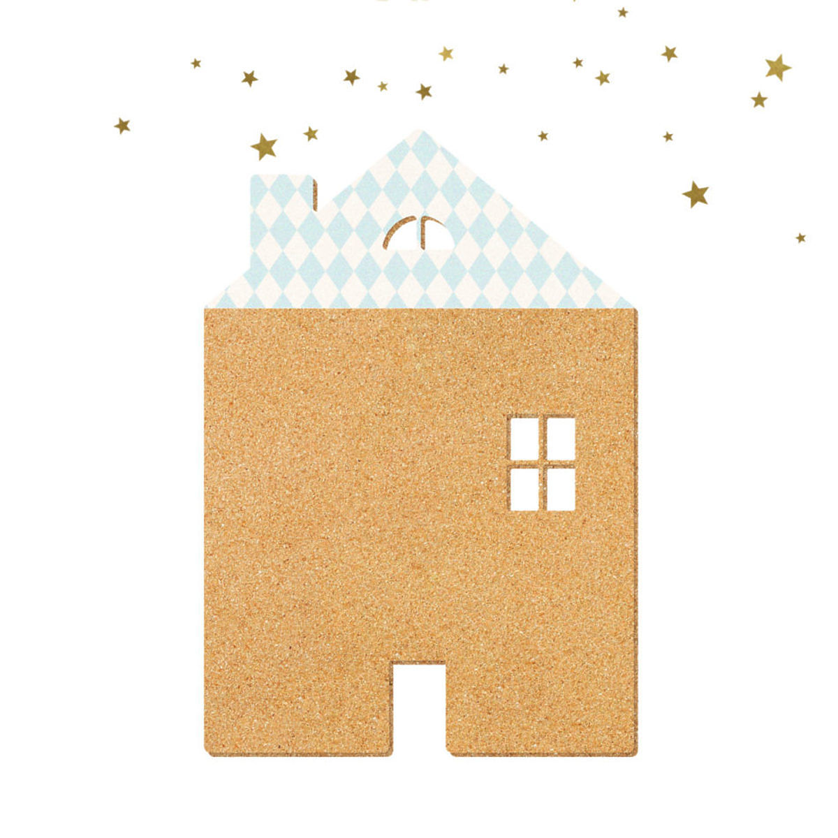 Élégant, tableau d'affichage pratique sous la forme d'une maison avec un toit bleu est idéal pour tous les élèves. Les belles étoiles d'or servent aussi de décoration.