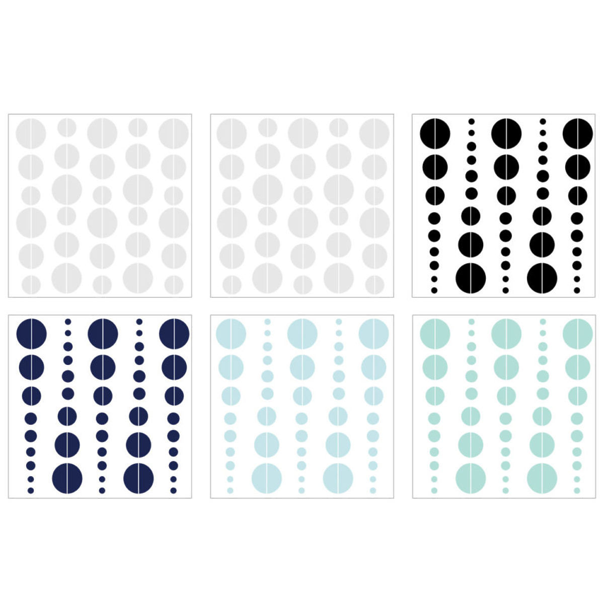 décorations murales Crescent est divisé en six feuilles: 2 gris, bleu 1, 1 bleu clair, 1 noir et 1 menthe. Croissants gris sur les deux feuilles de 120 pièces, noir, bleu foncé, bleu clair et menthe 30 pcs. Au total, il est possible de créer un grand nombre de combinaisons de couleurs.