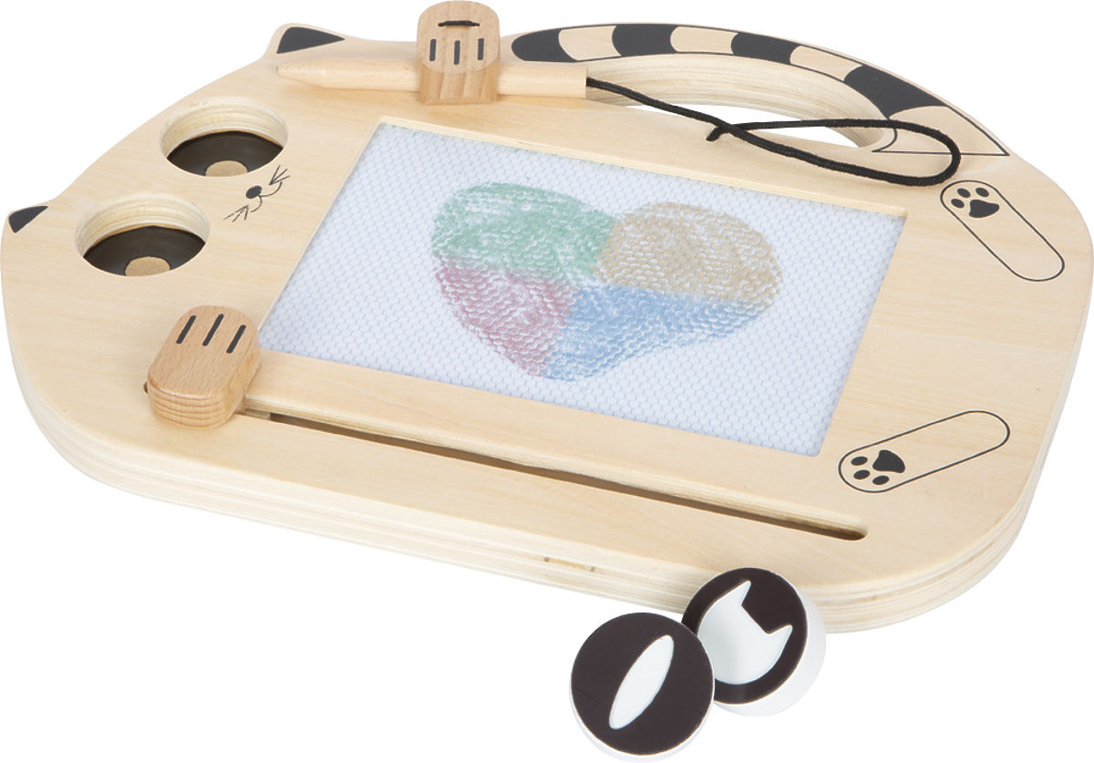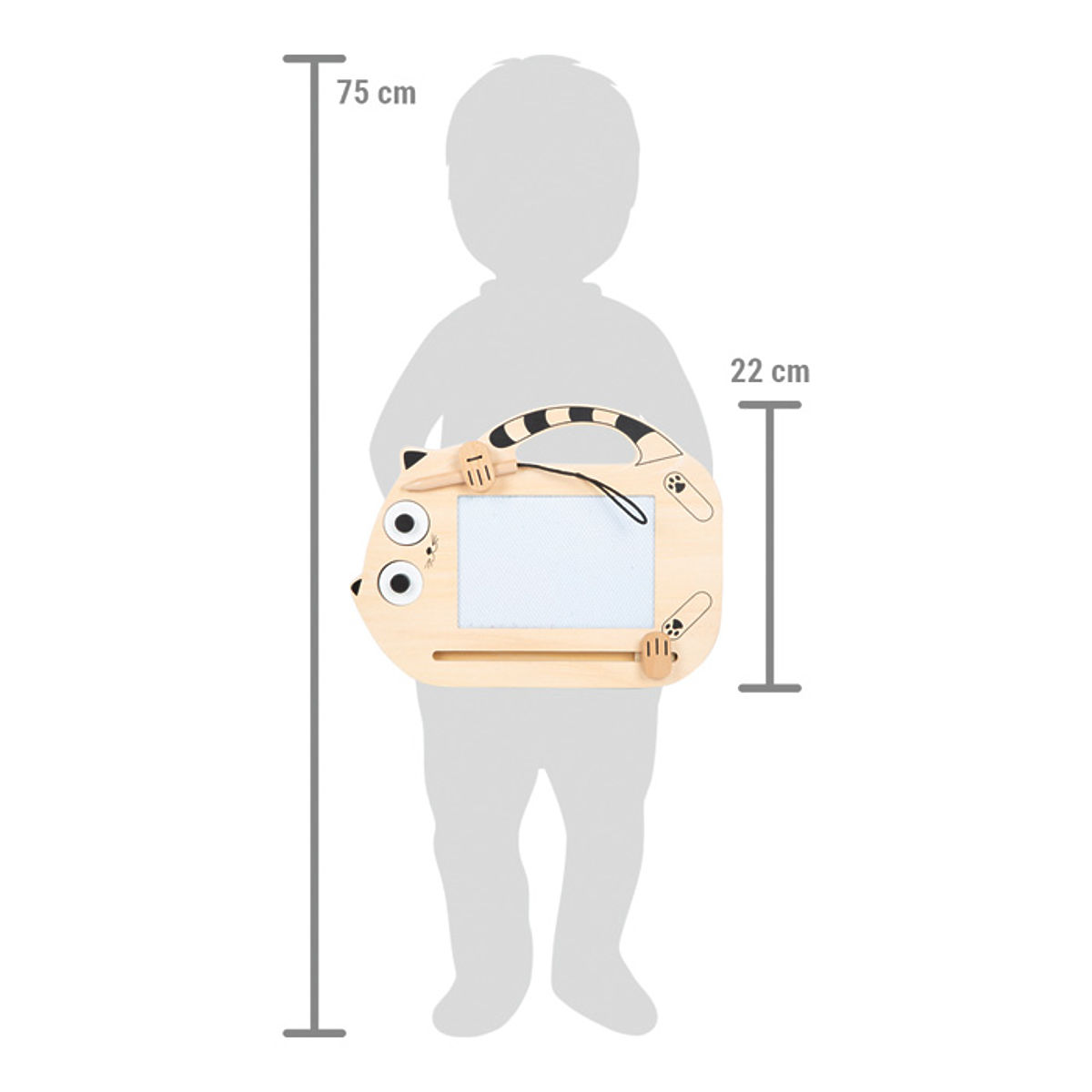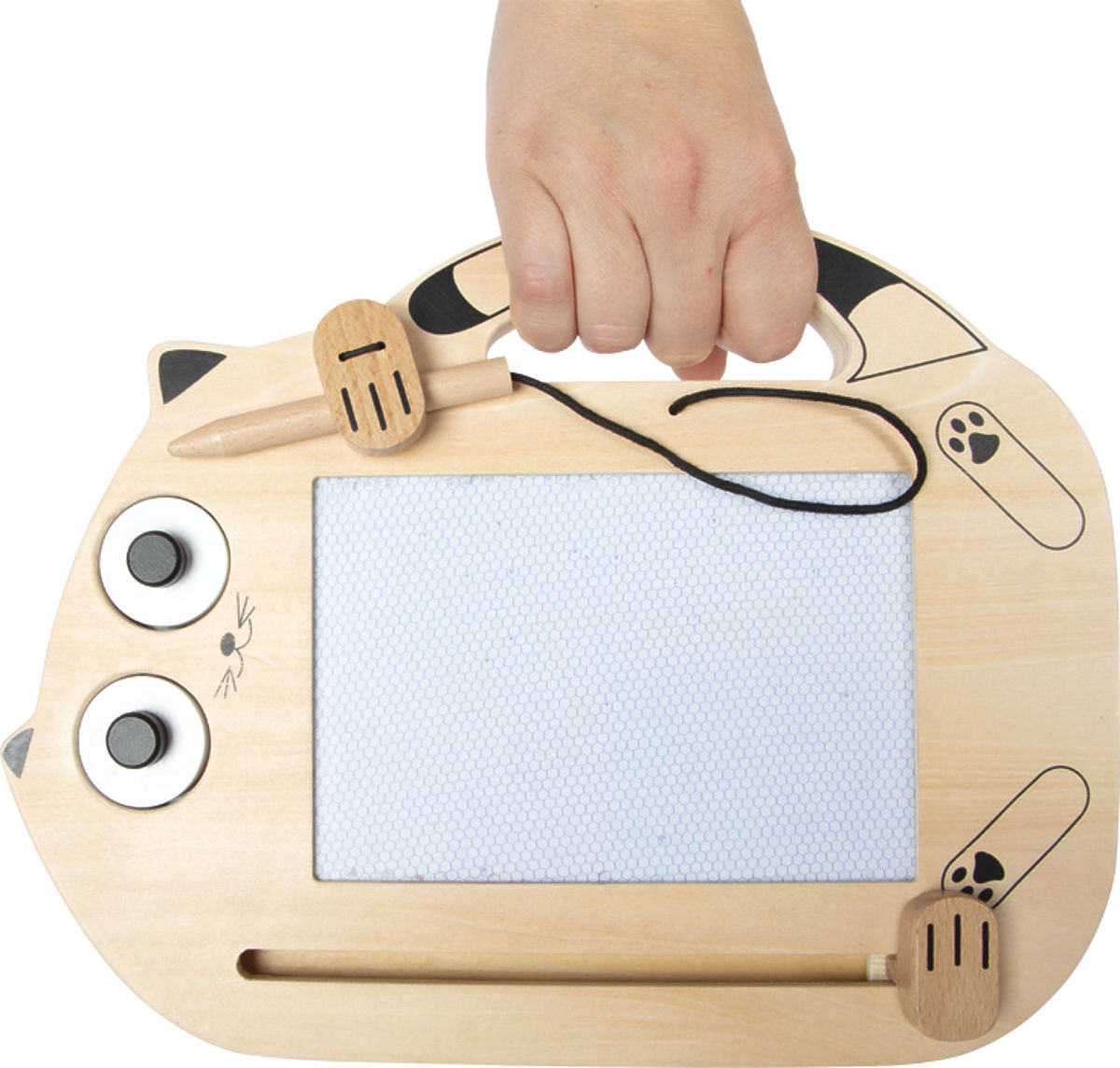 Divertissement créatif pour les petits artistes ! Le tableau de dessin magnétique en forme de chat est parfait pour les enfants qui aiment dessiner. Avec le stylo, il est possible de créer de nouveaux dessins encore et encore. Deux tampons avec des motifs d'yeux de chat et de tête de chat offrent d'autres possibilités de créer des œuvres d'art uniques. Lorsque le stylo n'est pas utilisé, il peut être fixé en toute sécurité sous la patte du chat, et grâce à la corde qui le relie au tableau, il ne se perd pas. Une fois le chef-d'œuvre terminé ou si vous souhaitez créer quelque chose de nouveau, l'image peut être facilement effacée à l'aide du curseur - tout est donc prêt en un rien de temps pour une nouvelle création ! Grâce à la poignée intégrée pour le transport et à ses dimensions compactes, le tableau peut être emporté partout. Profitez d'un divertissement créatif qui ne s'arrête pas même en voyage ! Principales caractéristiques : avec stylo en bois et 2 tampons, stylo attaché au tableau par une cordelette sous la patte, dessin infini avec gomme magique, avec poignée de transport, fabriqué en bois de haute qualité, adapté aussi pour les voyages.