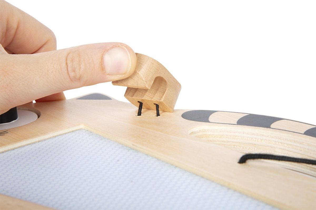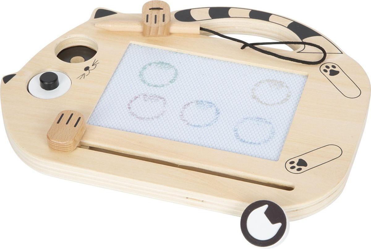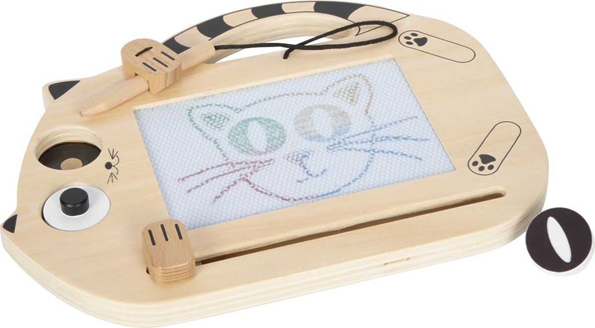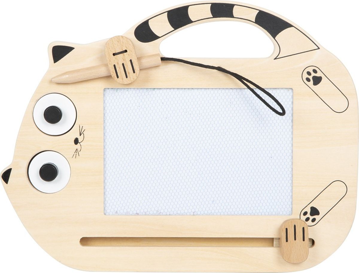 Divertissement créatif pour les petits artistes ! Le tableau de dessin magnétique en forme de chat est parfait pour les enfants qui aiment dessiner. Avec le stylo, il est possible de créer de nouveaux dessins encore et encore. Deux tampons avec des motifs d'yeux de chat et de tête de chat offrent d'autres possibilités de créer des œuvres d'art uniques. Lorsque le stylo n'est pas utilisé, il peut être fixé en toute sécurité sous la patte du chat, et grâce à la corde qui le relie au tableau, il ne se perd pas. Une fois le chef-d'œuvre terminé ou si vous souhaitez créer quelque chose de nouveau, l'image peut être facilement effacée à l'aide du curseur - tout est donc prêt en un rien de temps pour une nouvelle création ! Grâce à la poignée intégrée pour le transport et à ses dimensions compactes, le tableau peut être emporté partout. Profitez d'un divertissement créatif qui ne s'arrête pas même en voyage ! Principales caractéristiques : avec stylo en bois et 2 tampons, stylo attaché au tableau par une cordelette sous la patte, dessin infini avec gomme magique, avec poignée de transport, fabriqué en bois de haute qualité, adapté aussi pour les voyages.