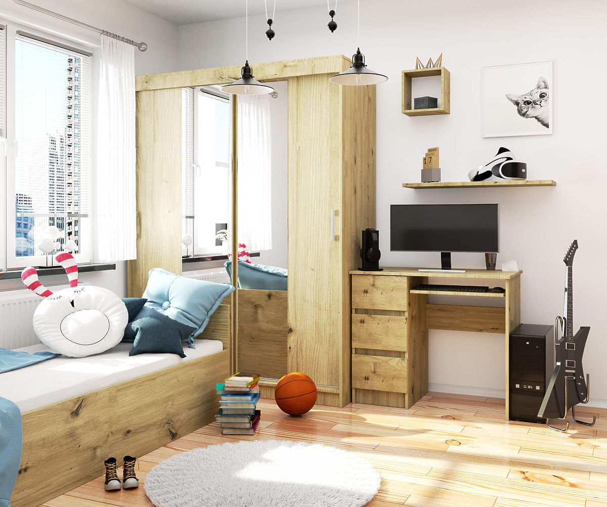 Le bureau d'ordinateur A-6 chêne artisan est parfaitement adapté à une chambre d'enfant ou d'adolescent, mais aussi à un bureau. Ses petites dimensions permettent également d'aménager un espace d'étude ou de travail à domicile dans une chambre ou un salon. Le bureau est également idéal pour les petits bureaux confortables. Grâce à la couleur chêne artisan, le meuble s'harmonise aussi bien avec des éléments de mobilier modernes que classiques.