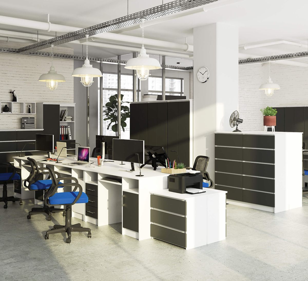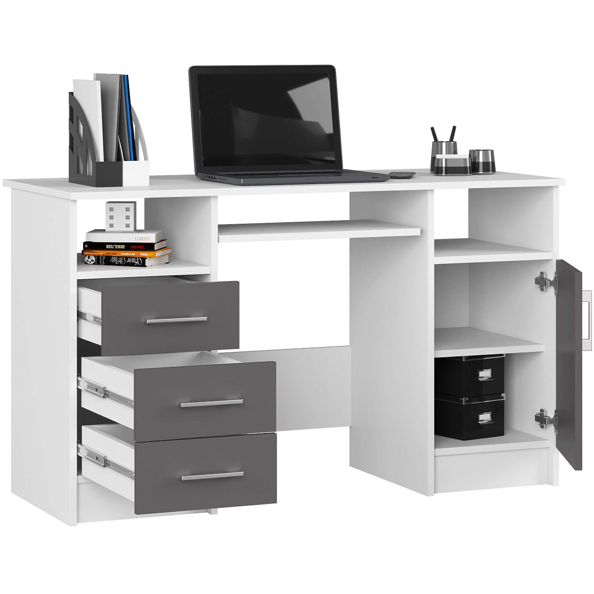 Le bureau informatique ANA 124 cm, grâce à la combinaison classique de blanc et de gris graphite, s'intègre facilement dans tout intérieur. Il a été conçu en pensant aux espaces de bureau et aux salles de travail. Il convient également à une chambre d'adolescent. Le plateau du bureau offre beaucoup d'espace – vous pouvez y placer un moniteur et d'autres objets de travail nécessaires selon vos besoins. Pour le clavier, il y a une étagère coulissante séparée. Le bureau offre une grande quantité d'espace pour un agencement libre : deux niches, trois tiroirs et une armoire avec une étagère. Toute la structure est fabriquée en panneau laminé, facile à entretenir et résistant à l'usure. Le bureau ANA est élégance, fonctionnalité et solidité en un seul.