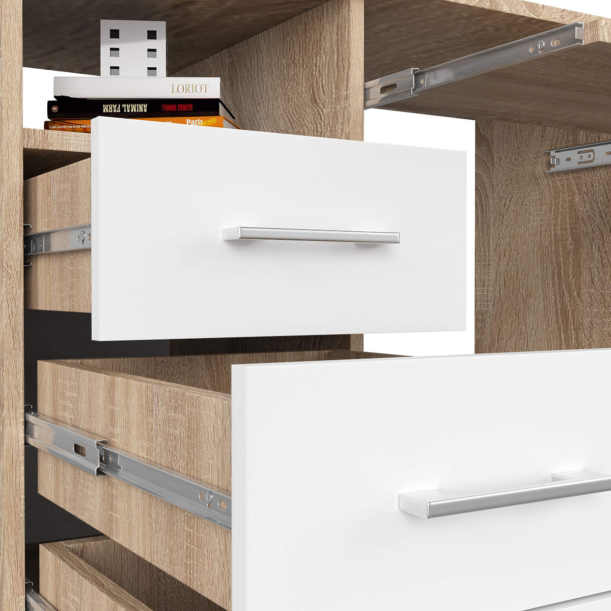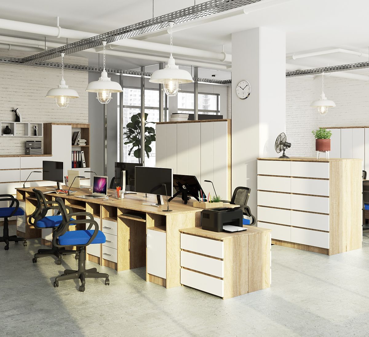 Le bureau informatique ANA est fabriqué en panneau de meuble laminé résistant à l'usure dans deux couleurs. Le corps du bureau est constitué d'un panneau laminé couleur chêne sonoma, tandis que les façades des tiroirs et la porte sont en blanc. Fonctionnellement, le meuble est divisé en 3 parties. Les parties extérieures sont des armoires, tandis que la partie centrale est destinée au travail. Sous le plateau de la partie centrale se trouve une tablette coulissante pour clavier, tandis que dans les parties extérieures se trouve une étagère ouverte. Sous l'étagère du côté gauche du meuble, 3 tiroirs sont disposés les uns au-dessus des autres, tandis qu'à droite se trouve une armoire avec une porte rabattable contenant 2 étagères.