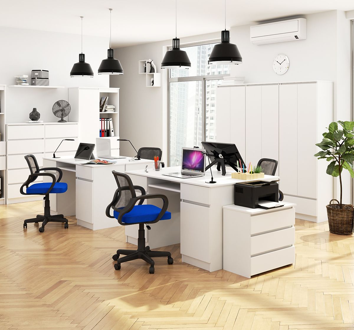 Le bureau A5 est fabriqué en panneau stratifié de haute qualité et robuste de 16 mm d'épaisseur. Tant le corps que les façades de ce meuble sont disponibles dans une couleur blanche à la mode et universelle. Le meuble est équipé d'une étagère pratique pour le clavier, de deux tiroirs et de deux armoires, offrant un espace de rangement considérable. Le plateau du bureau mesure 135 cm de long et 50 cm de profondeur, ce qui est suffisamment grand pour accueillir confortablement un moniteur, un ordinateur portable ou des fournitures de bureau. Ce bureau est spacieux tout en étant compact, avec une hauteur de 77 cm et chaque tiroir et armoire mesurant 40 cm de long. Grâce à ses dimensions et à son apparence esthétique et moderne, ce modèle est idéal tant pour une chambre d'étudiant que pour un bureau.