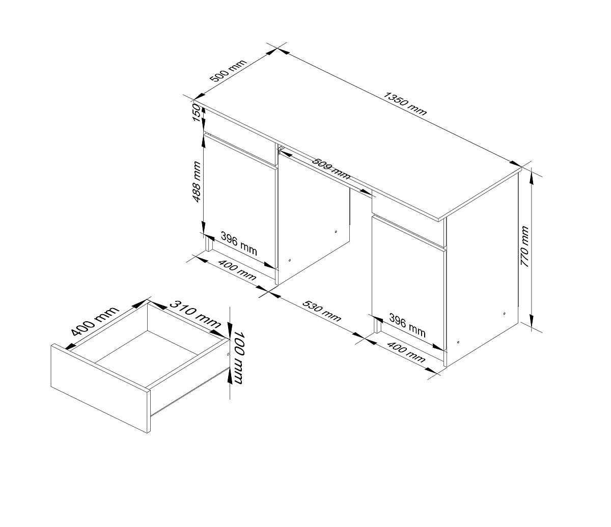 Le bureau a une longueur de 135 cm, une hauteur de 77 cm et une profondeur de 50 cm. Sa taille est donc optimale pour tout utilisateur d'ordinateur qui apprécie le confort et l'espace, ce qui est particulièrement important lors de longues heures de travail devant l'écran d'un ordinateur portable. De plus, le meuble est impeccable d'un point de vue visuel.
