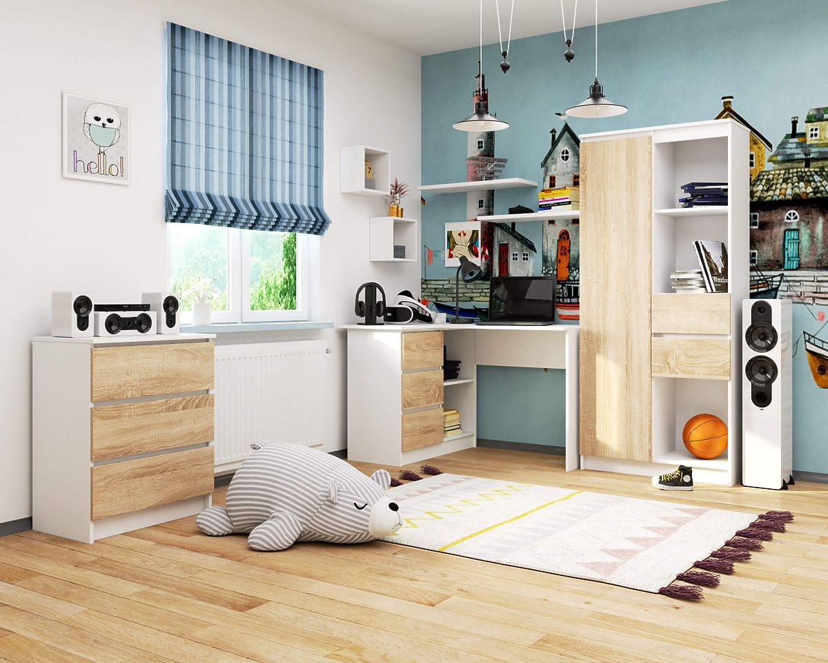 Comment choisir un bureau pour une chambre d'adolescent ? Principalement en fonction de la fonctionnalité. La chambre d'un adolescent doit remplir de nombreuses fonctions diverses, offrant un espace à la fois pour l'apprentissage et le divertissement. Le bureau d'angle informatique que nous avons l'honneur de présenter est une proposition moderne créée sur mesure pour les besoins des jeunes. Il se caractérise par une construction solide et un panneau laminé de qualité utilisé lors de la fabrication. Il est durable et résistant aux rayures. Facile à nettoyer, le bureau se distingue également par un aspect intéressant qui plaira certainement aux adolescents. L'offre est disponible à un prix compétitif. Le produit présenté convient parfaitement non seulement à une chambre d'adolescent, mais aussi à une chambre d'enfant ou à un bureau à domicile. Il peut également être utilisé dans un bureau, où il séduira par son utilisation pratique, son grand espace pour un aménagement individuel et son design universel et intemporel. Nous vous invitons à l'achat.