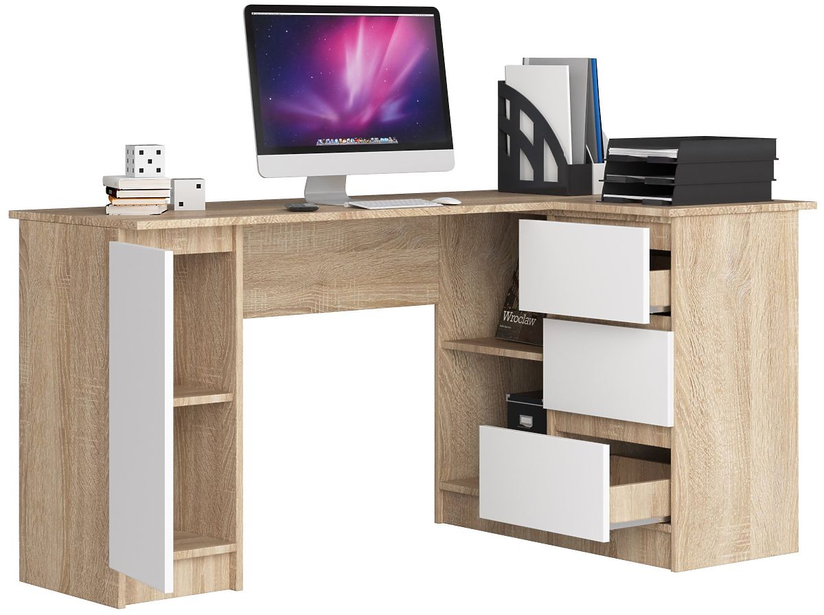 Le bureau d'angle B20 dans la couleur unique du chêne Sonoma convient à un intérieur traditionnel. Le produit est enrichi de faces blanches pour les portes des tiroirs et des étagères et est destiné à un usage d'angle. Il a une hauteur optimale de 77 cm, permettant d'adapter l'espace de travail aux besoins individuels. Les petites dimensions et le poids léger du meuble permettent son montage à n'importe quel endroit. Le bureau est fabriqué en panneau stratifié de haute qualité de la société Kronospan. Il dispose de pratiques étagères et tiroirs qui facilitent le rangement même des accessoires plus grands. De plus, les systèmes de tiroirs sont enrichis de glissières à rouleaux métalliques, facilitant leur ouverture et fermeture. Pour une meilleure protection des bords, un chant ABS a été utilisé, empêchant les dommages mécaniques. Le bureau est livré en kit pour un montage personnel. L'emballage comprend également un manuel d'utilisation pratique et une garantie de 2 ans du fabricant, protégeant le meuble acheté.