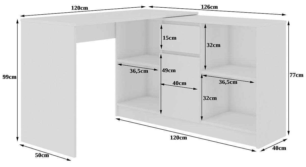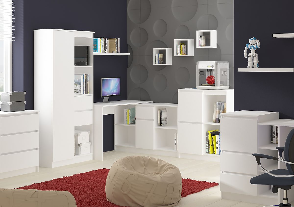 Solution innovante. Le bureau peut être combiné avec la commode pour former un bureau d'angle très facilement. La possibilité d'acheter la commode et le bureau séparément est un autre atout de notre mobilier. Le mobilier est universel pour une utilisation à droite ou à gauche, il suffit de placer la commode de l'autre côté du bureau.