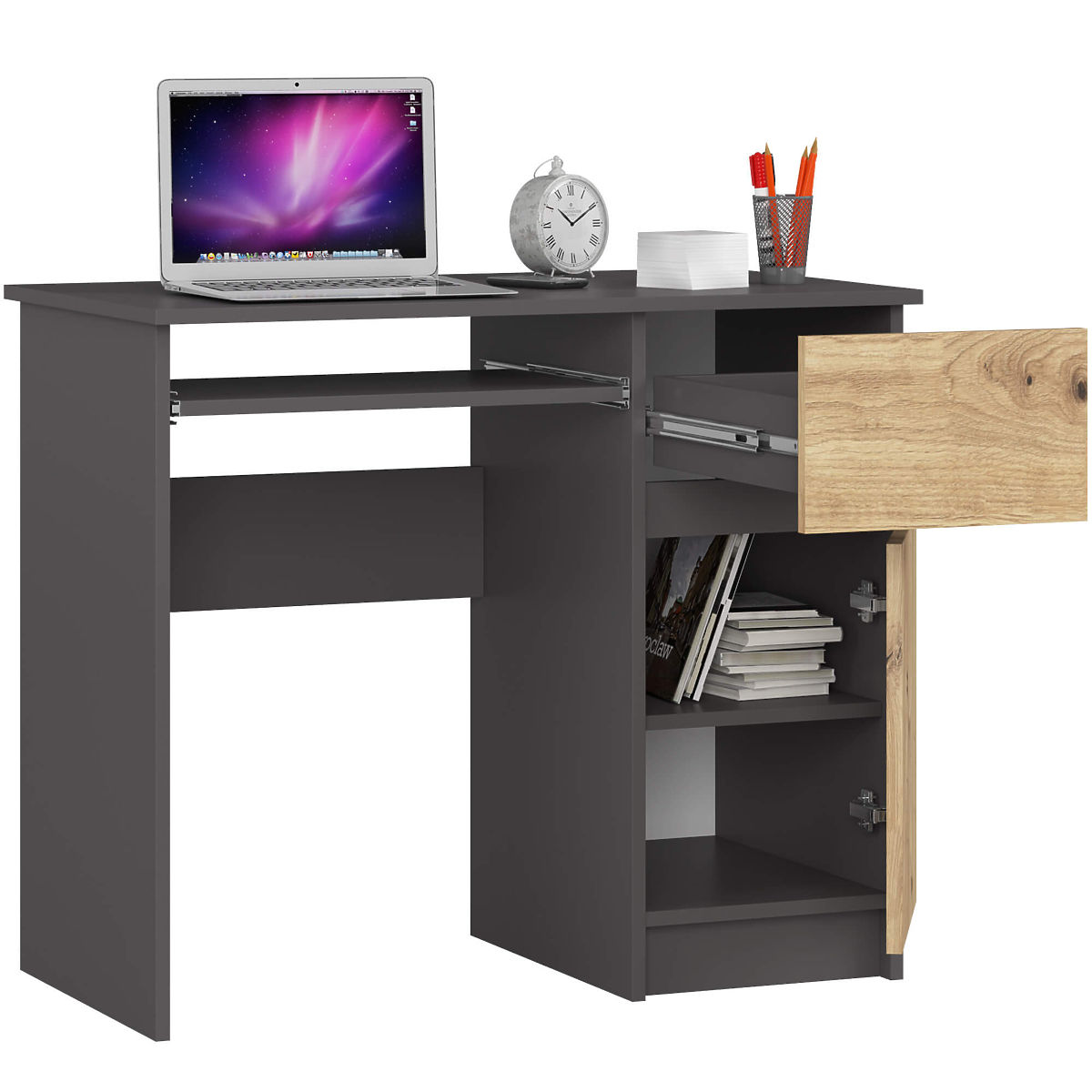 Le bureau indépendant PIKSEL de 90 cm en couleurs GRIS GRAPHITE/CHÊNE ARTISAN est une solution idéale pour les petits intérieurs. Il convient très bien comme bureau scolaire ou informatique. Sa conception ergonomique assure un confort d'utilisation. Le bureau est équipé d'une tablette coulissante pour clavier, d'un tiroir latéral pratique et d'un placard avec étagère pouvant accueillir des classeurs et des livres. Le bureau est fabriqué avec un plateau mat agréable au toucher et facile à entretenir, recouvert d'une couche de stratifié résistant à l'abrasion. Le tout est complété par des poignées pratiques de couleur argentée.