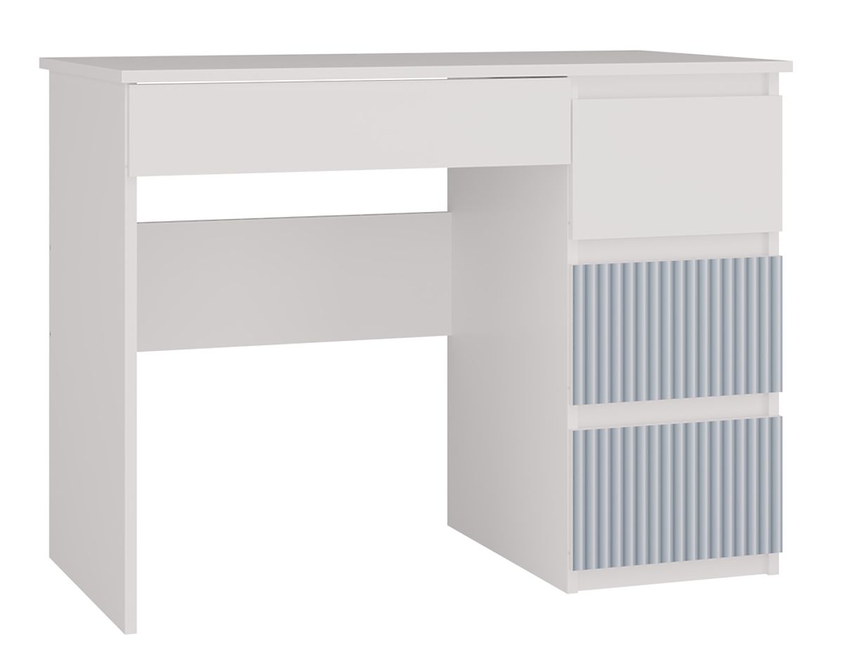 3 tiroirs hauts spacieux à droite (dont 2 tiroirs avec motifs bleus) et 1 tiroir bas à gauche sous le plateau
