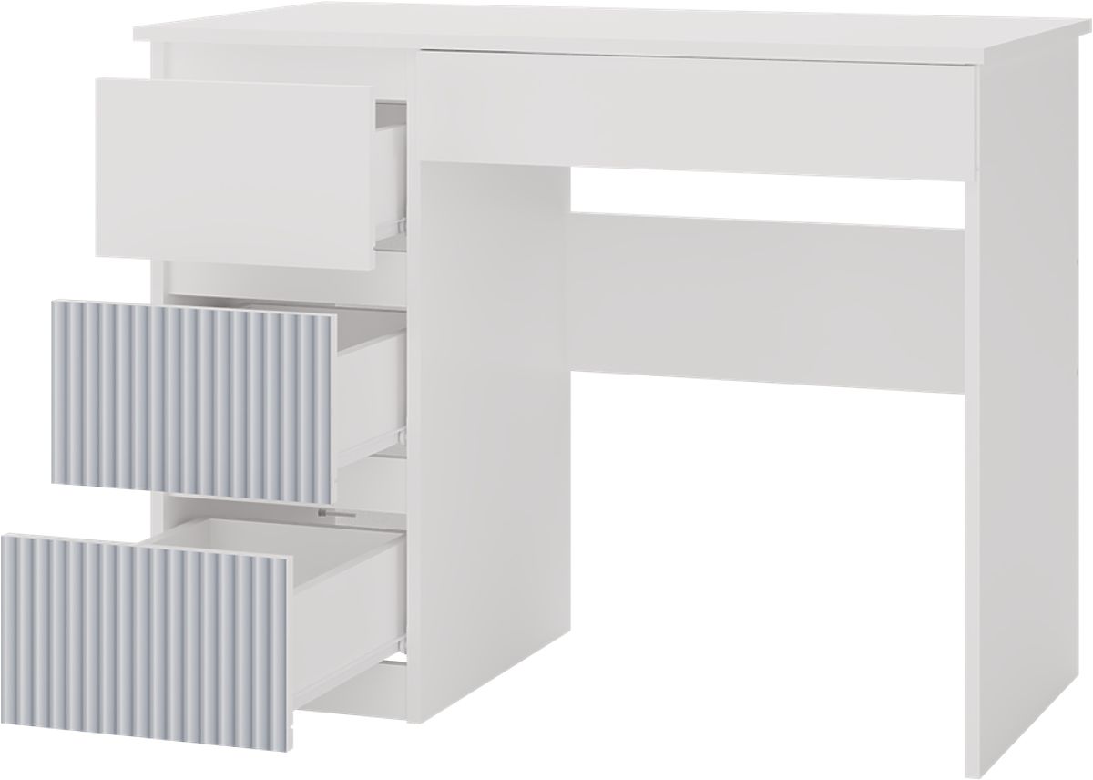 3 tiroirs hauts spacieux à gauche (dont 2 avec motifs bleus) et 1 tiroir bas à droite sous le plateau