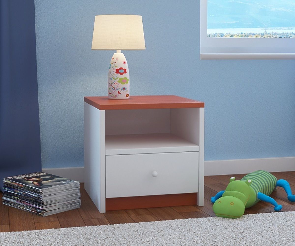 En dehors de panneau brun -orange, la table de chevet est blanche, elle est ainsi adaptée aux chambres de filles ainsi qu´à celles de garçons.