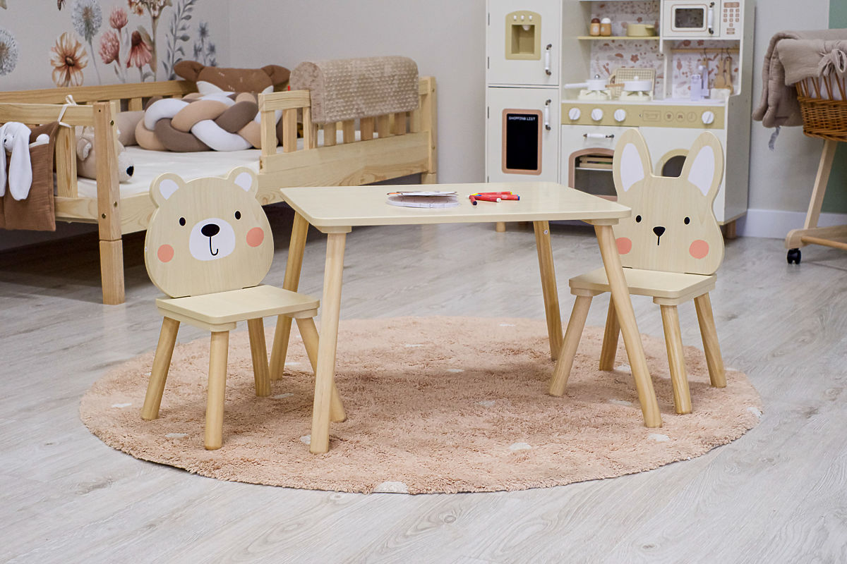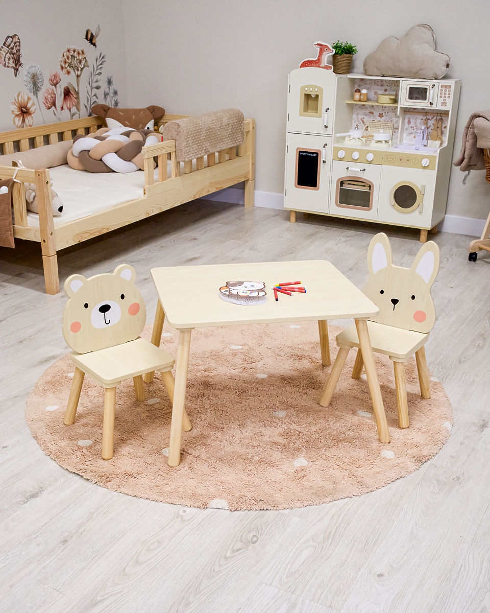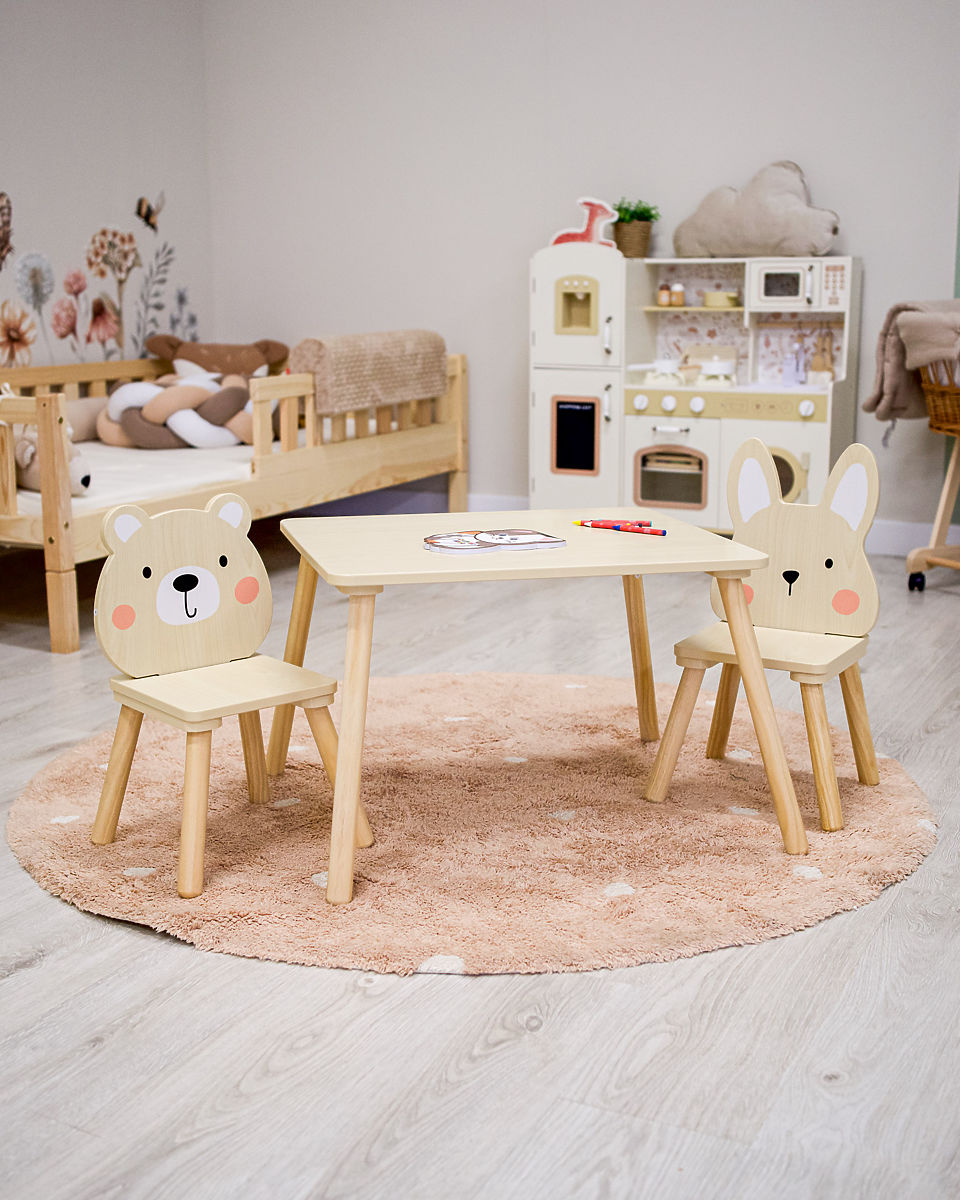 Transformez la chambre ou la salle de jeux des enfants en un espace joyeux et ludique avec notre table en bois et ensemble de deux chaises "Amis de la forêt". Cet ensemble est parfait pour les petits explorateurs et créateurs qui souhaitent dessiner, construire ou jouer avec des amis.