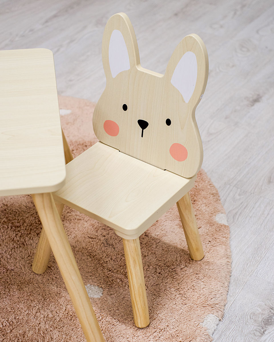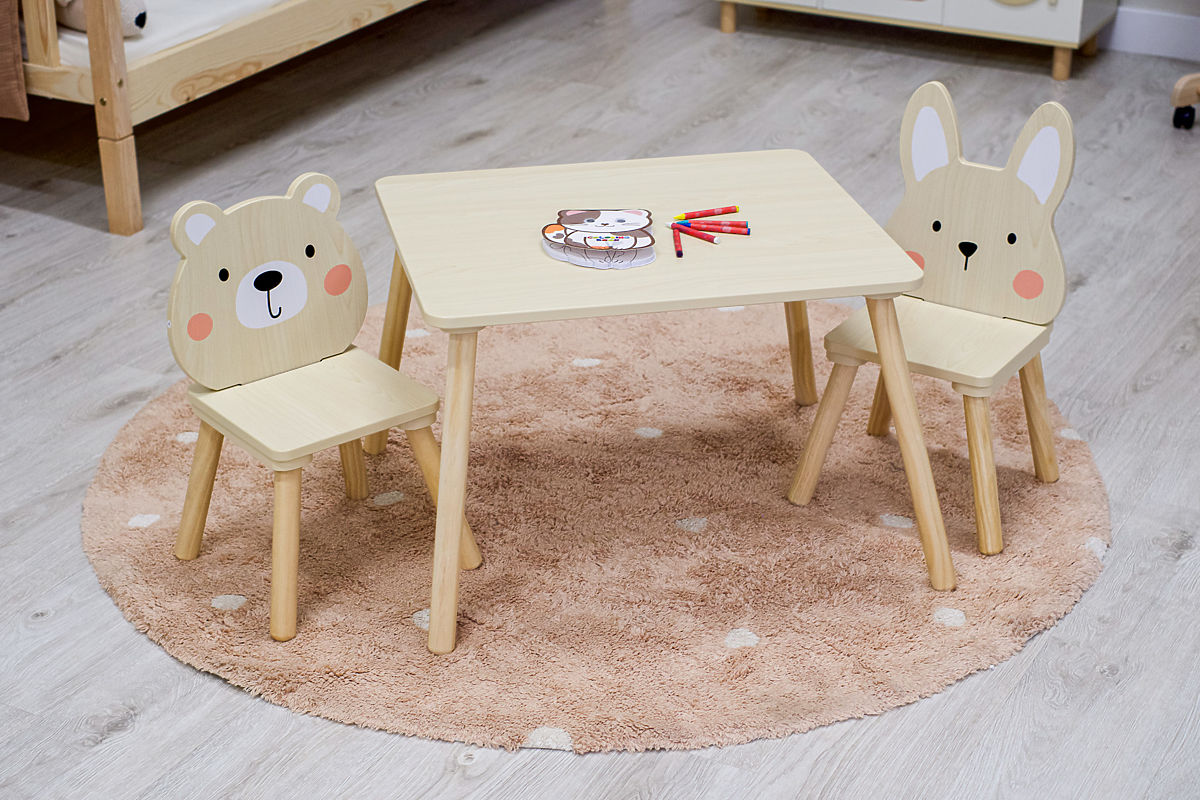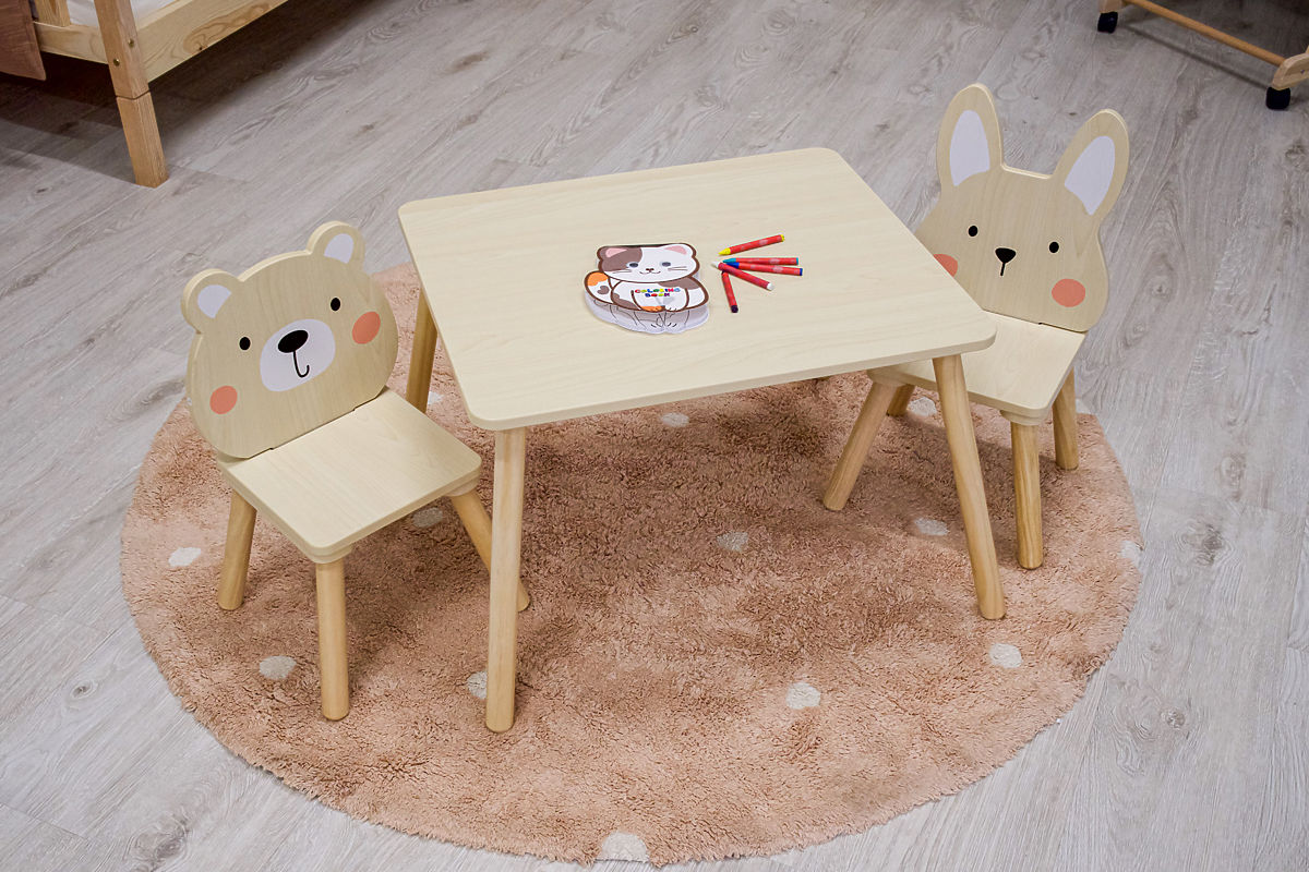 Transformez la chambre ou la salle de jeux des enfants en un espace joyeux et ludique avec notre table en bois et ensemble de deux chaises "Amis de la forêt". Cet ensemble est parfait pour les petits explorateurs et créateurs qui souhaitent dessiner, construire ou jouer avec des amis.