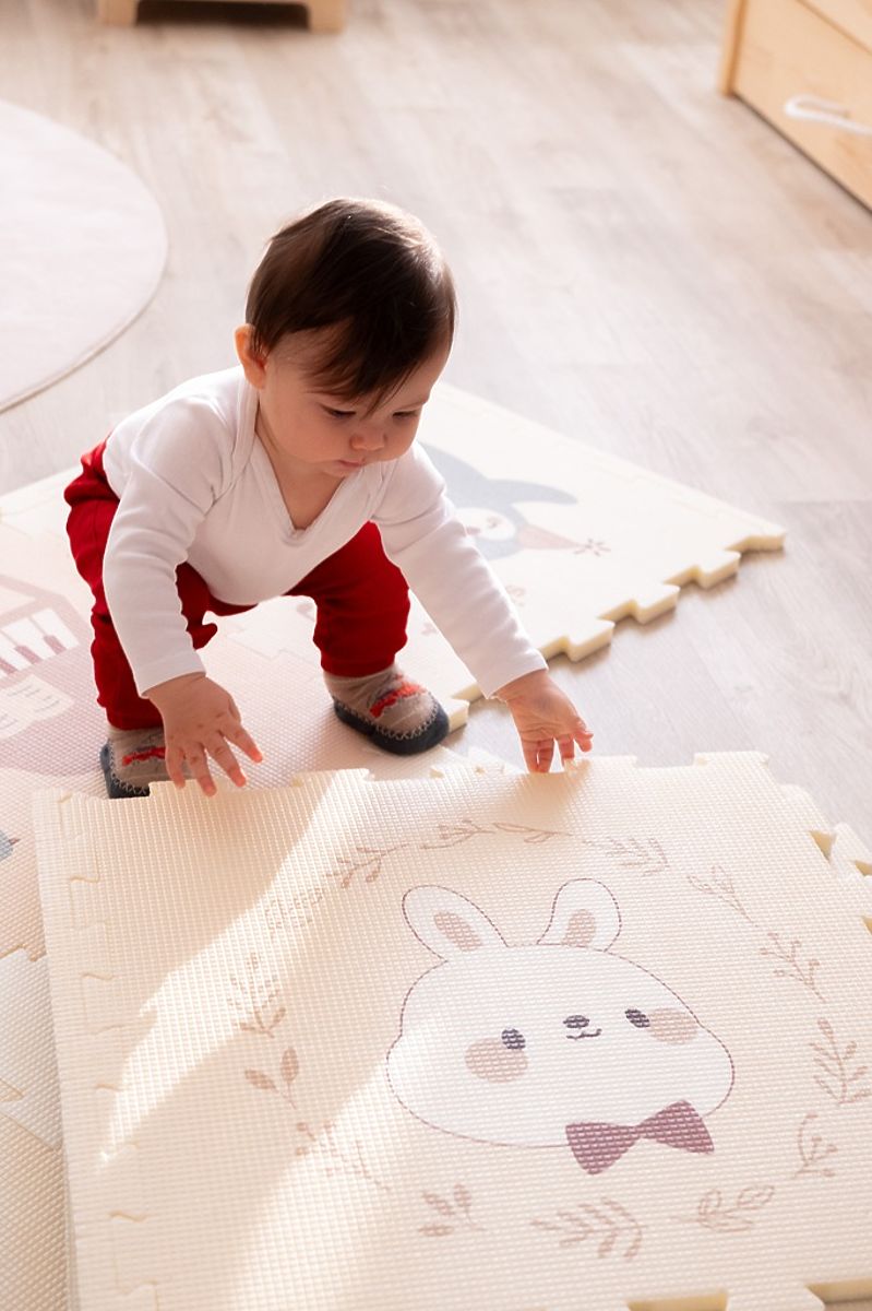Le tapis de jeu en mousse est composé de 9 carrés qui se connectent facilement pour former une surface pratique et confortable de 180x180 cm pour jouer. Le tapis est fabriqué en matériau doux et sûr, offrant confort et protection aux enfants lorsqu'ils se déplacent au sol. Chaque pièce présente des animaux adorables stylisés en musiciens, entourés de motifs musicaux et de notes, stimulant l'imagination des enfants et leur joie de découvrir. Le tapis est idéal pour une utilisation à la maison et aide à développer la perception sensorielle et la créativité. La combinaison de tons naturels avec du blanc et une finition de qualité font de ce tapis un bel ajout à toute chambre ou salle de jeux. Principales caractéristiques : 9 carrés, matériau en mousse doux et sûr, assemblage facile des pièces, motifs de musique et d'animaux musiciens, stimule la perception sensorielle et la créativité, convient aux enfants à partir de 6 mois.