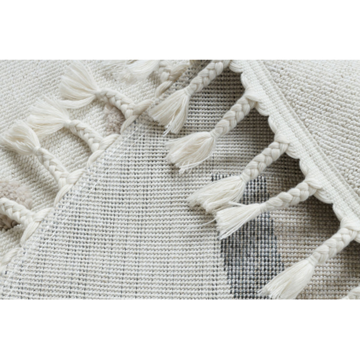 Tapis rond pour enfants avec motifs nuage et arc-en-ciel, surface structurée et franges. .. plus