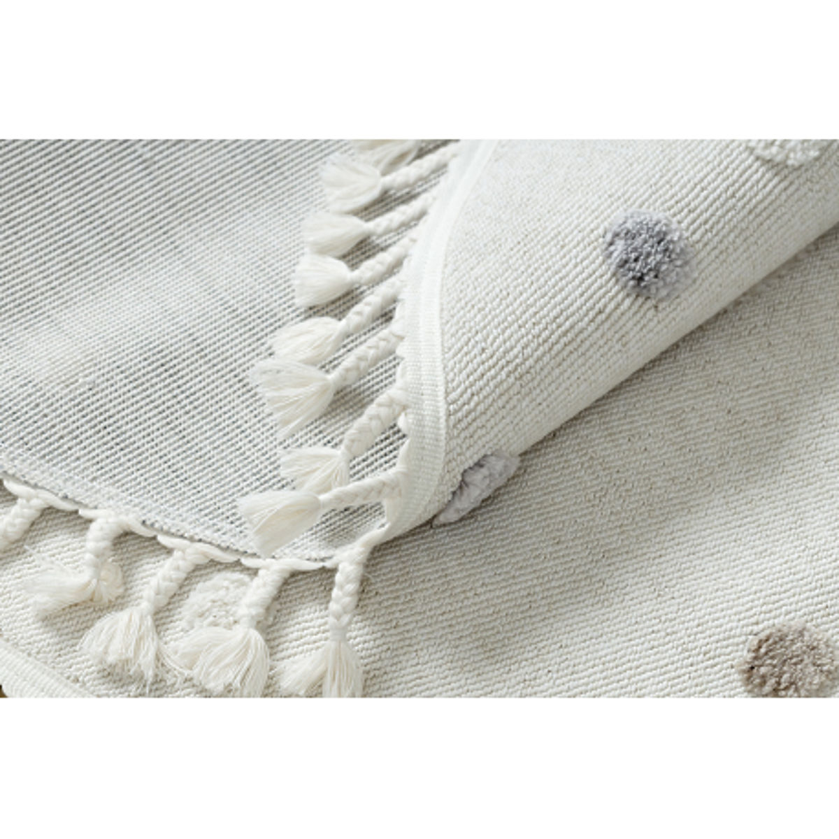 Le tapis a une surface structurée avec des franges, ce qui favorise une expérience tactile et visuelle et stimule la créativité et la curiosité des enfants. Le fil de polyester garantit que le tapis est doux, agréable au toucher et facile à entretenir. L'épaisseur du tapis varie entre 8 mm et 16 mm, offrant confort pour jouer et se reposer. Le poids dépend du motif du tapis et varie entre 2,0–2,50 kg/m².